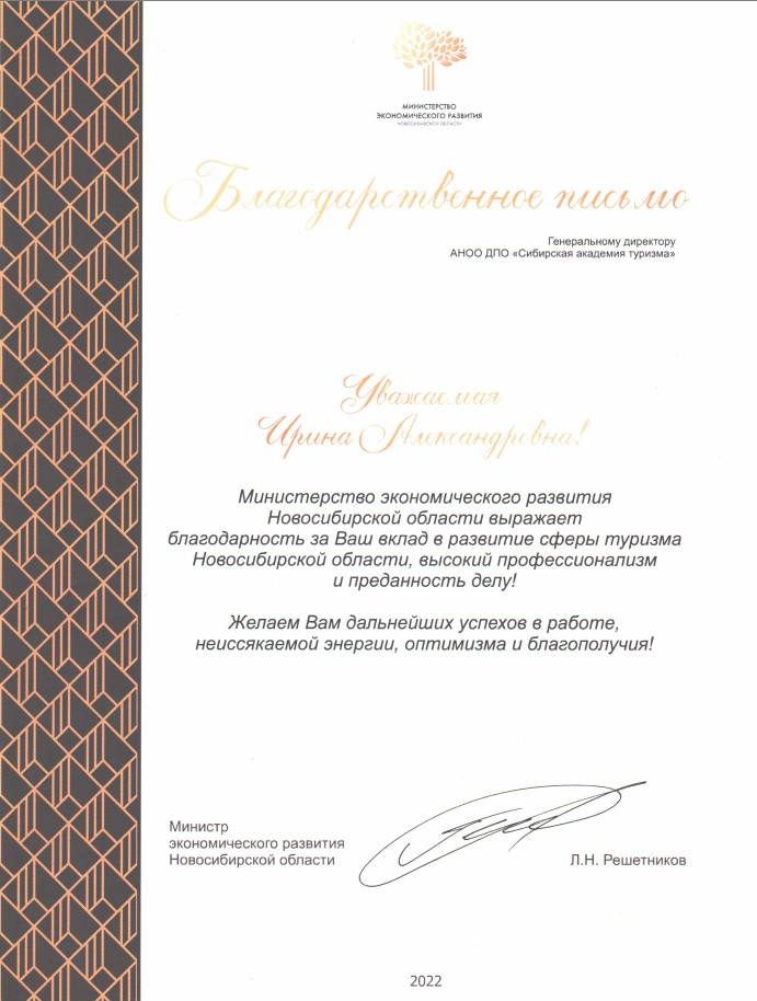 Департамент инвестиций, потребительского рынка, инноваций и предпринимательства мэрии города Новосибирска выражает благодарность Генеральному директору АНОО ДПО «Сибирская Академия Туризма», Председателю комитета по туризму и гостиничному бизнесу Союза «Торгово-промышленная Палата Новосибирской области» Беленок Ирине Александровне