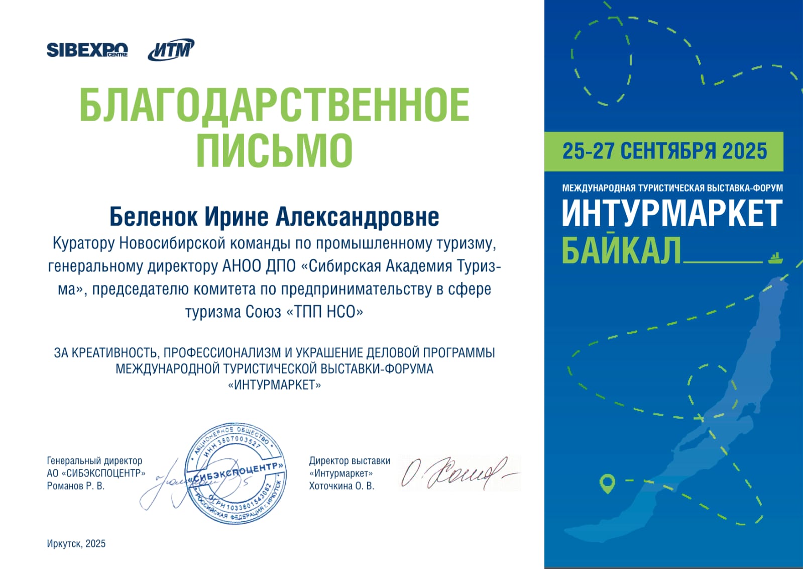 Генеральный директор АО «СИБЭКСПОЦЕНТР» Романов Р.В. и Директор выставки «Интурмаркет» Хоточкина О.В. выражают благодарность куратору Новосибирской команды по промышленному туризму, генеральному директору АНОО ДПО «Сибирская Академия Туризма», председателю комитета по предпринимательству в сфере туризма Союз «ТПП НСО» Беленок Ирине Александровне